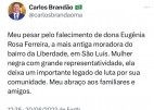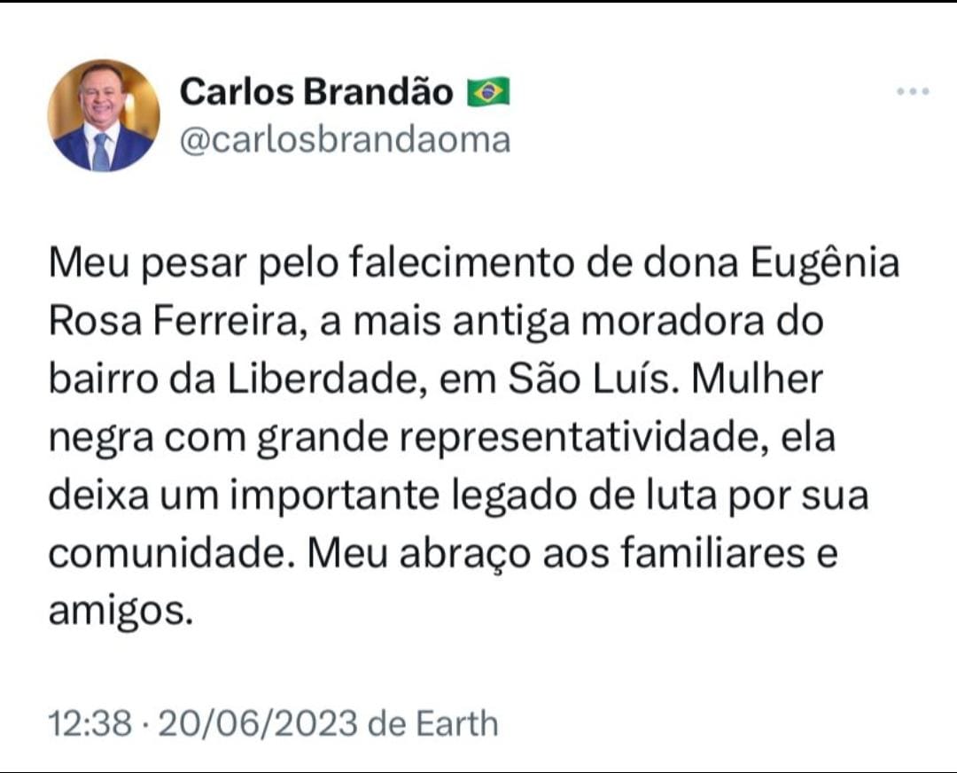 O governador Carlos Brandão lamentou a morte da matriarca e destacou que ela era “uma mulher negra com grande representatividade e que deixa importante legado de luta por sua comunidade”. E manifestou solidariedade aos familiares e amigos.