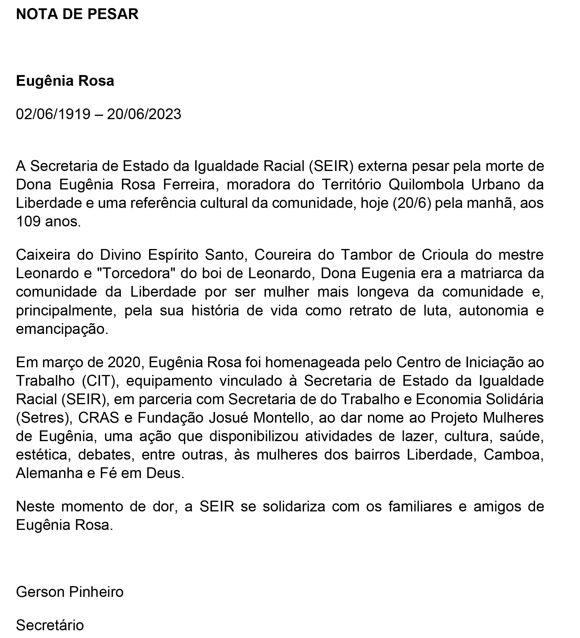 A Secretaria de Estado da Igualdade Racial (SEIR) emitiu Nota de Pesar pela morte de Dona Eugênia Rosa Ferreira em que destaca esse papel.