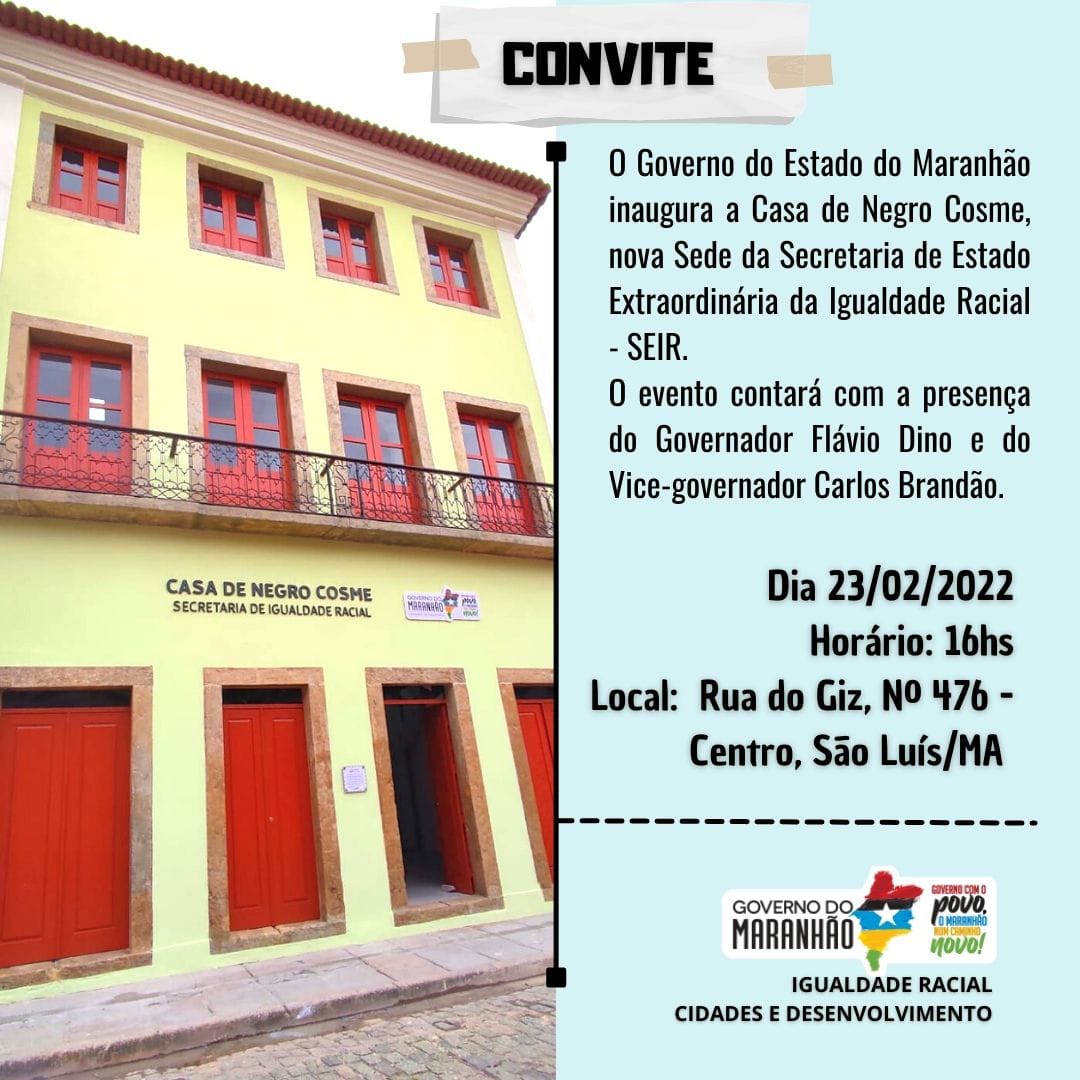 Convite: Inauguração da Casa de Negro Cosme Compartilhar via Telegram Compartilhar via WhatsApp Compartilhar via Facebook Compartilhar via Twitter Compartilhar via email 22/02/2022
